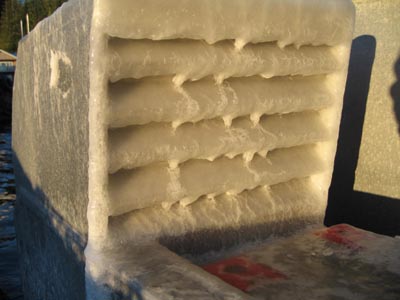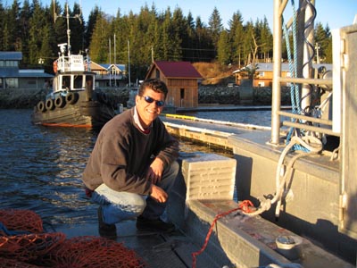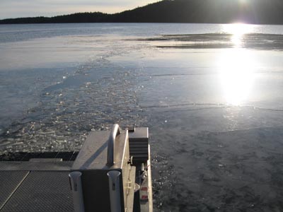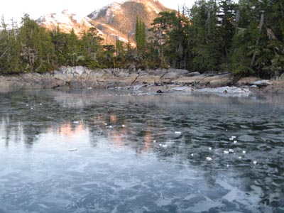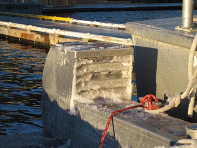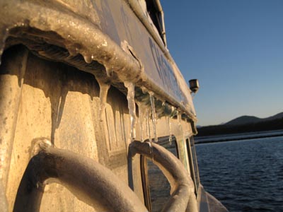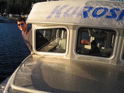 |  | The Kuroshio is covered isn freezing spray from the night before. We traveled from Campbell river to Shearwater that day departing at 8 am and arriving at 6 pm, with one stop for fuel in Port Hardy. It was quite cold out, but sunny and warn in the cabin as ussual. For most of the trip we had to pound through heavy chop maybe 3-5 or more. |